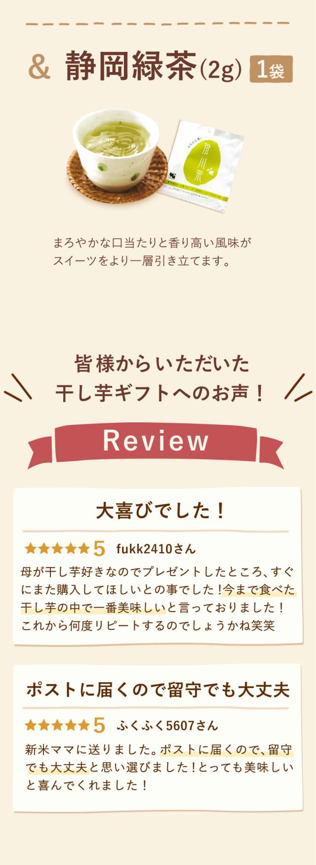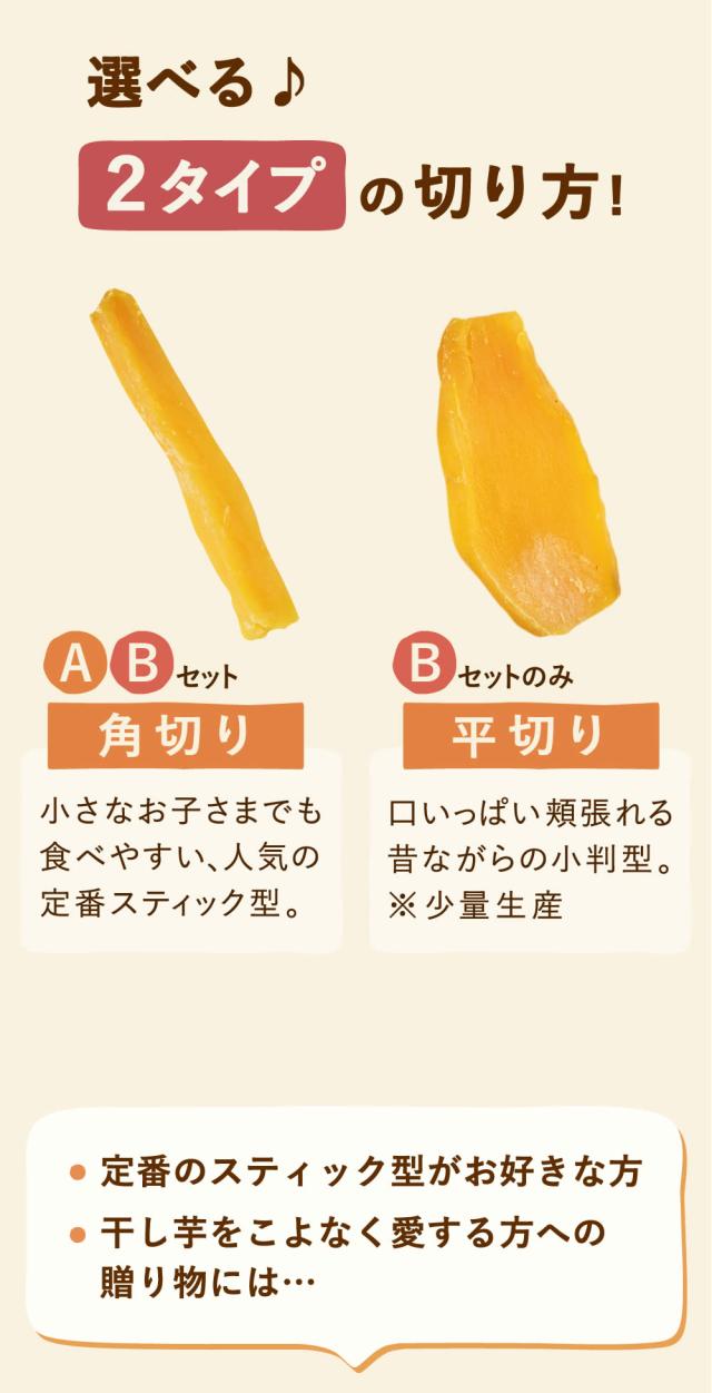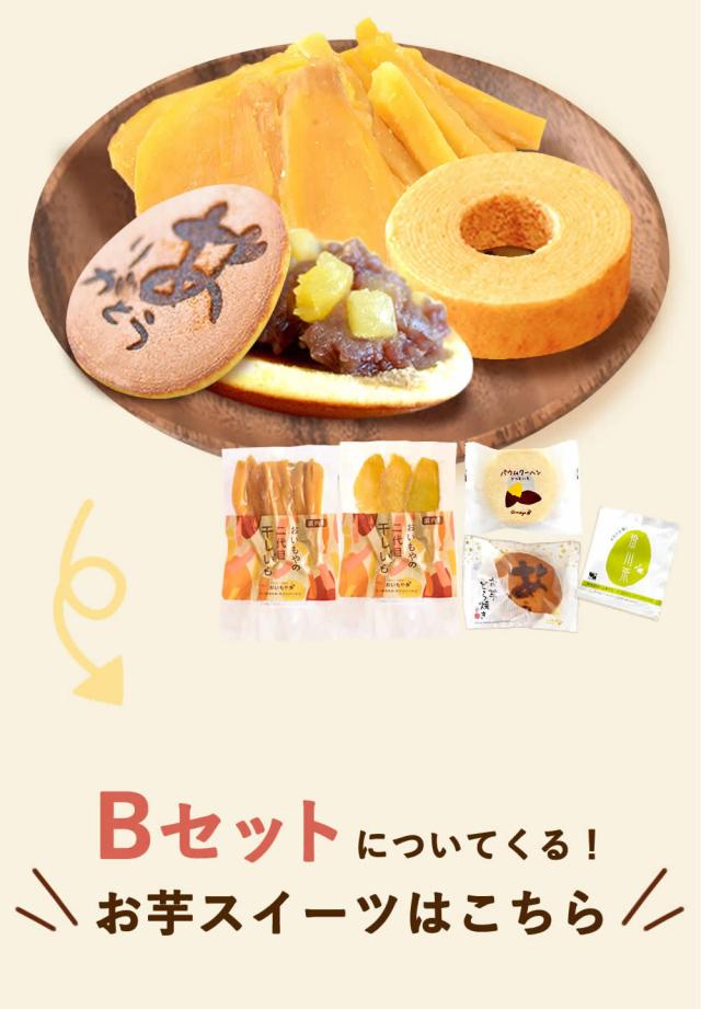 | 商品内容 | [Aセット] ・二代目おいもやの干し芋(角切り) 100g×3袋 [Bセット] ・二代目おいもやの干し芋(角切り) 100g×1袋 ・二代目おいもやの干し芋(平切り) 100g×1袋 ・お芋どら焼き×1個 ・スイートポテトバウムクーヘン×1個 ・静岡緑茶 2g×1袋 |