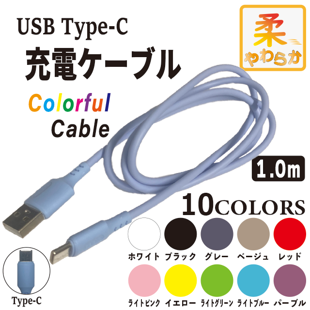 【3本購入で+1本プレゼント!】 カラフル Type-C ケーブル 1m PVC 充電 アンドロイド 【商品レビュー記入でポイント10%還元】