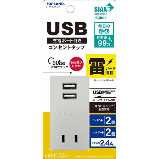 トップランド USB付きスマート 電源タップ タップ 2.4A 雷ガード 直挿し 2個口 スイッチ無 2ポート STPP300-GR