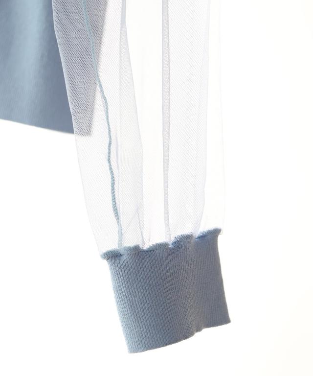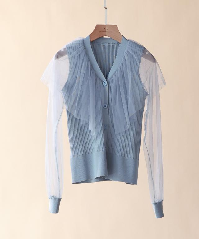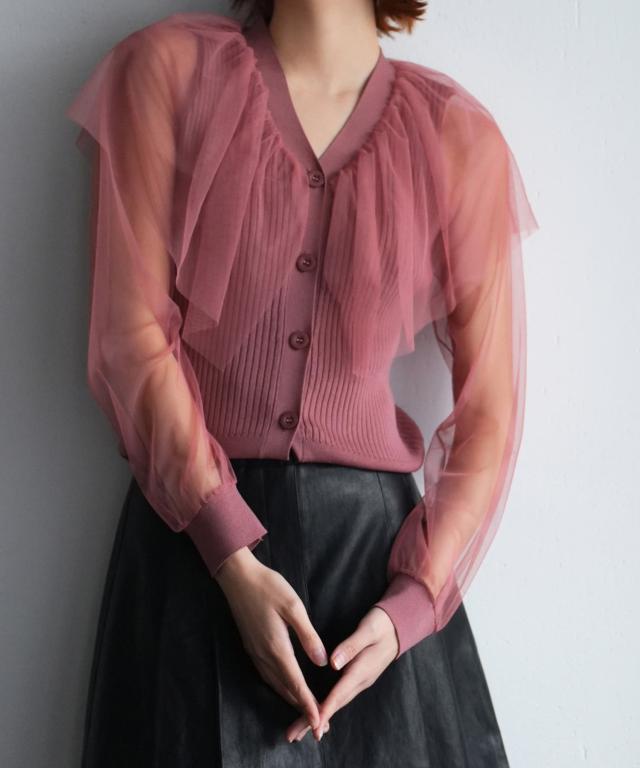 チュールスリーブ×リブニットの異素材ドッキングカーディガン