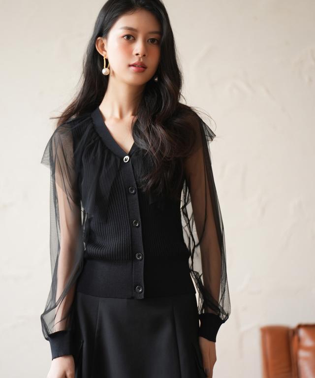スタイリングを華やかにアップグレードする、チュール×リブニットの異素材ドッキングカーデ。