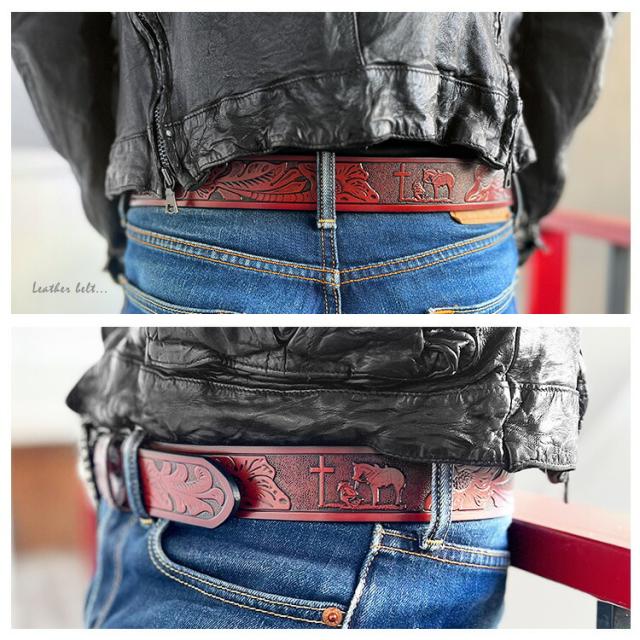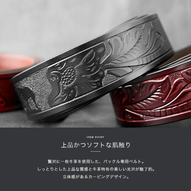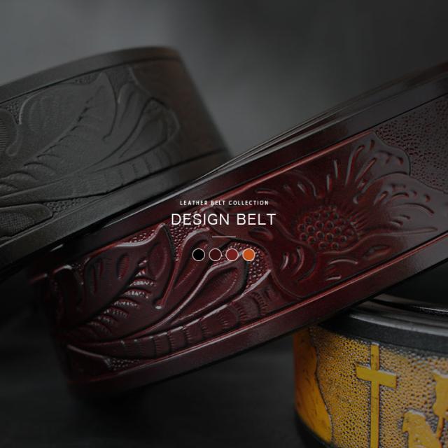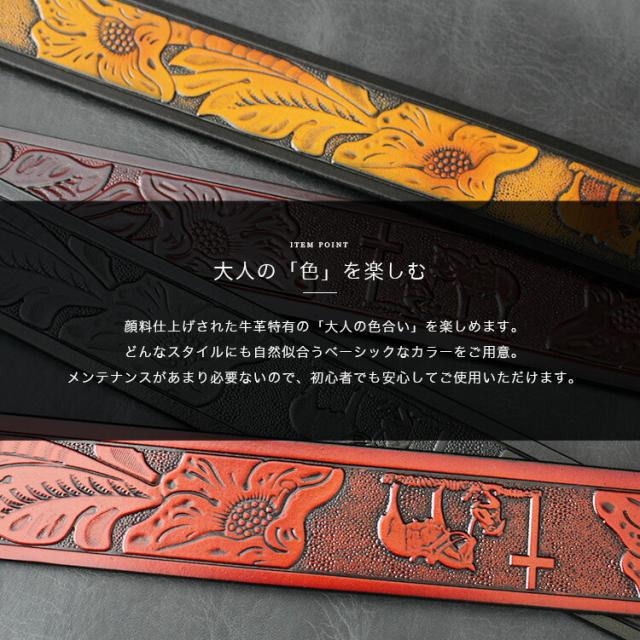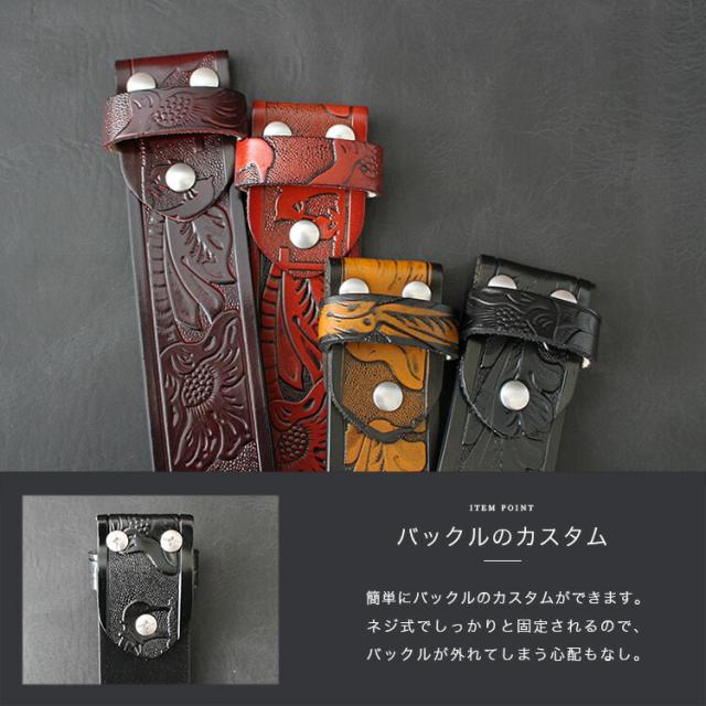 顔料仕上げの牛革を使用して製作したレザーベルトです。全体に美しいフラワーカービングが施されています。ネジ式でバックルが留められるようになっているのでお好みのバックルを付けて使用することができます。※ピン型バックルを取り付ける場合は縦型の穴空けが必要です。