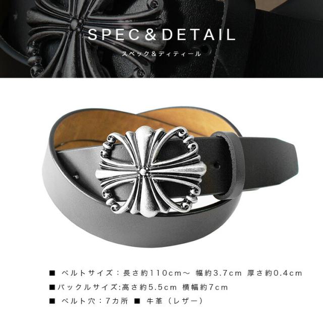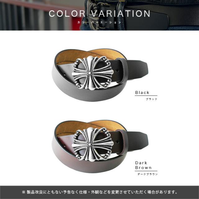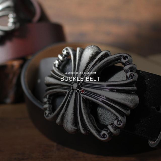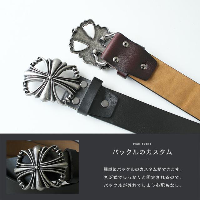 本革製のベルトにデザインバックルを組み合わせたバックルベルトです。アイアンクロスのゴシックデザインにクロムメッキの渋い風合いがウエストトップのアクセントになります。ネジ式でバックルが留められるようになっているのでお好みのバックルを付け替えて使用することができます。