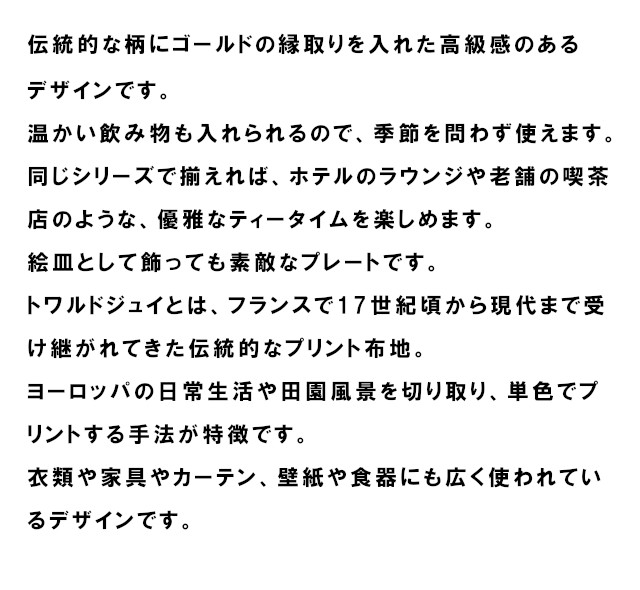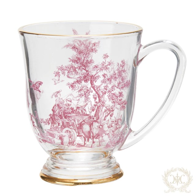 上品な深みのあるボルドーカラーでヨーロッパの人々の生活をプリントしたトワルドジュイシリーズのガラスのマグカップ。 |