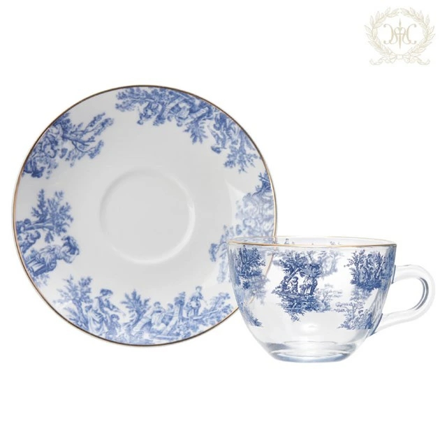 上品な深みのあるブルーでヨーロッパの人々の生活をプリントしたトワルドジュイシリーズのガラスのティーカップ。 |