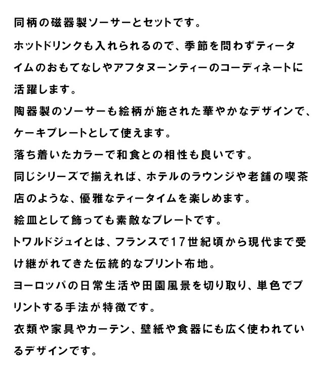 ホットドリンクも入れられるので、季節を問わずティータイムのおもてなしやアフタヌーンティーのコーディネートに活躍します。