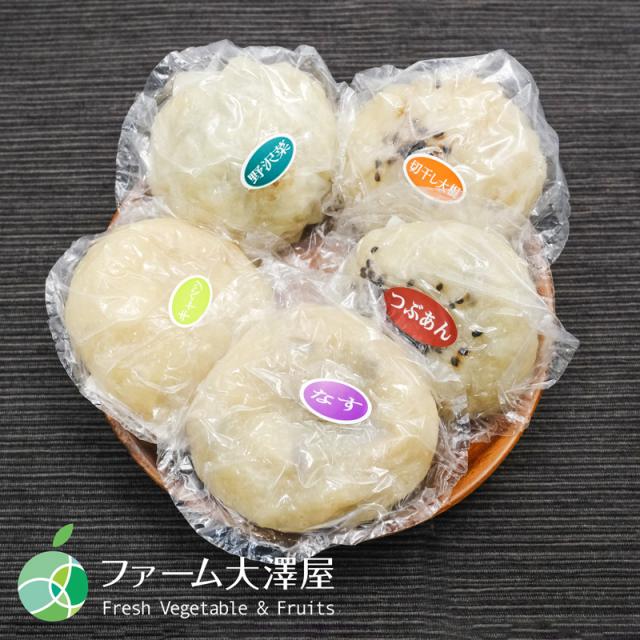 おやきの本場・信州長野の老舗が作る“蒸かしおやき”です。具材は野沢菜、なす、切干し大根、キャベツ、つぶあんの5種類です。