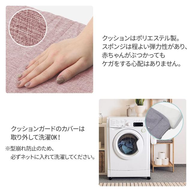 クッションの中は形状をキープする芯が入っているので伸ばした状態での使用はもちろん、折り曲げて角を丸くすることもできます。スポンジは程よい弾力性があるので、赤ちゃんがぶつかってもケガをする心配はありません。