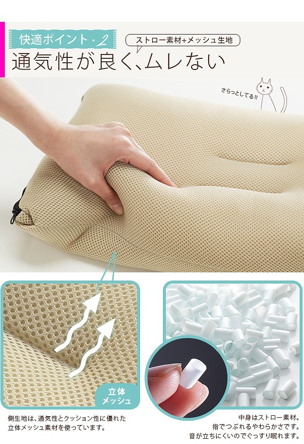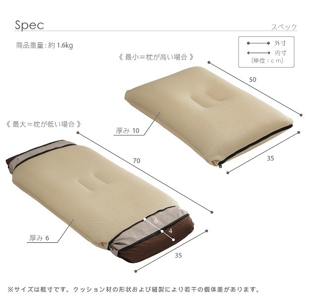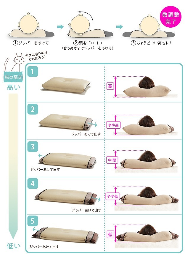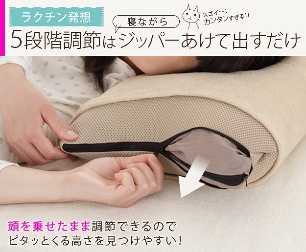 商品について:高さ調節枕ラクーナ。横になって頭を枕にあてた状態でも簡単に高さ調節が出来る枕。分割して作られた特殊形状により、両サイドのファスナーを開け閉めすることで中材パイプが動き、寝ながらでも簡単に高さ調節ができます。中材を取り出すタイプの保管の煩わしさを解消しました。中央部は頭部を安定的に支えるようにマチが縫製されています。側地は通気性に優れたメッシュ地。専用の枕カバー付きです。枕本体もカバーも丸洗いOK!清潔に保てます。サイズ(cm):幅35x奥行50〜70x厚さ10〜6cm・約1.6kg(中材パイプ-1.3kg)材質:側地-ポリエステル100%(立体メッシュ)、中材-パイプ、枕カバー生地-綿100%(パイル地)完成品日本製