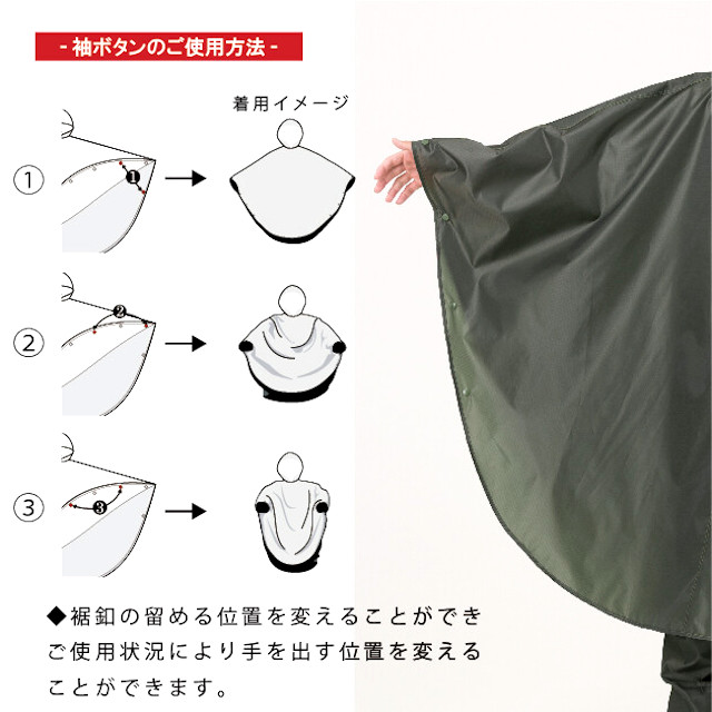 袖口に使用している釦は、留める位置を変えることができ、ご使用状況により手を出す位置を変えることができます。