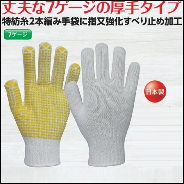 サイズ/ M( 男性用 小さめサイズ ) カラー/ 白 素 材/ 手袋 : ポリエステル・綿・その他 すべり止め : 塩化ビニール 特 長/ 特 長/ 7 ゲージの厚手タイプだから丈夫。特紡糸 2 本編みの手袋にす べり止め加工。小指又を下げた「三本胴編み」で手にフィット。