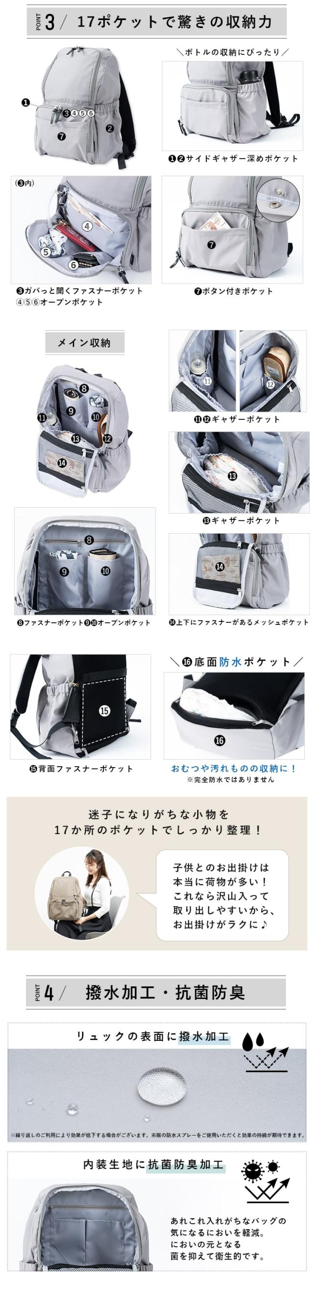 マザーズバッグ リュック マザーズリュック 大容量 自立 撥水 抗菌 防臭 17ポケット 軽量 通院 子連れ 子育て レディース ママ 家族 おしゃれ シンプル リュックサック ママカル プレゼント ギフト
