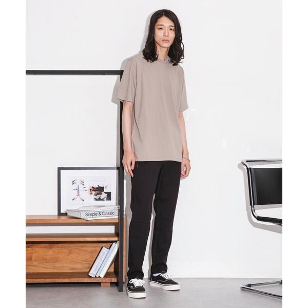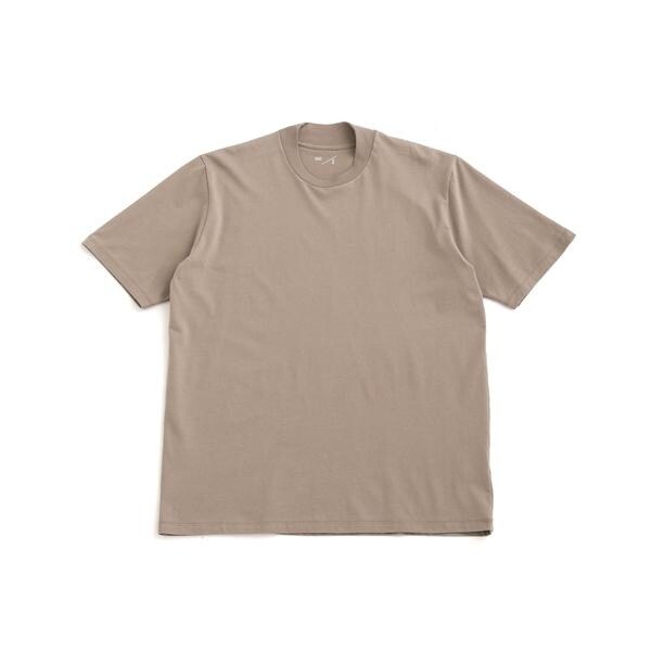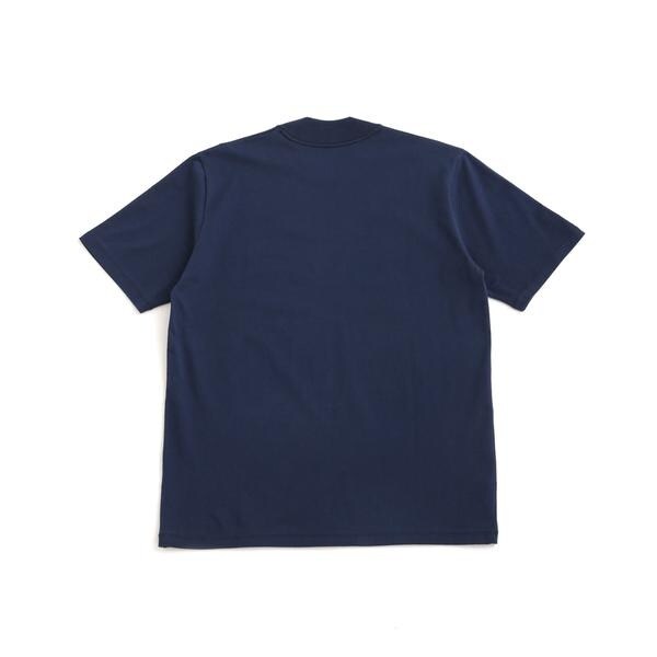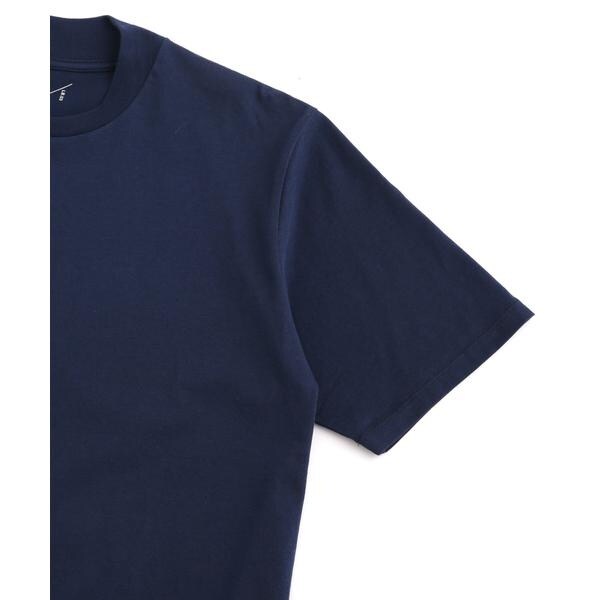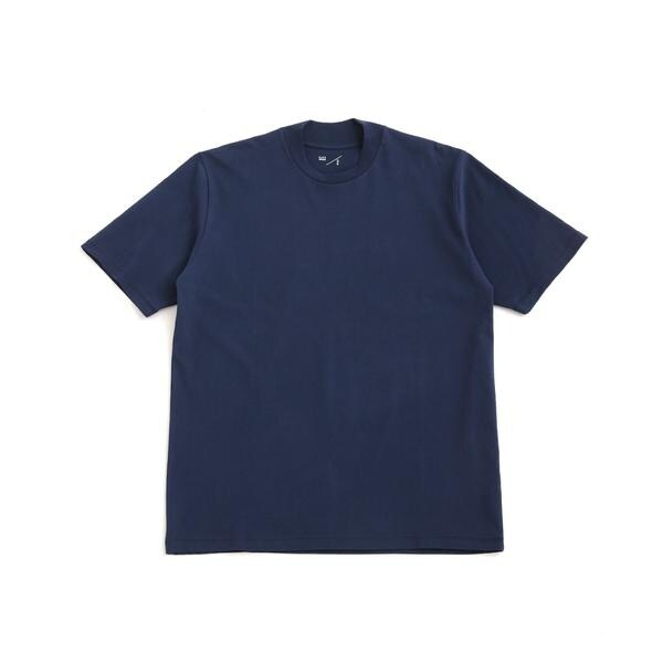 特徴的なネックデザインは、クルーネックの後襟にかけてリブを高くしており、