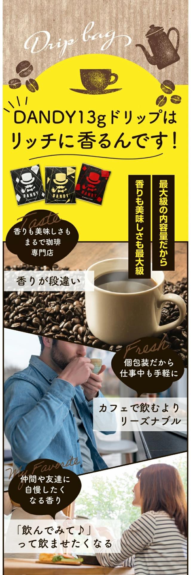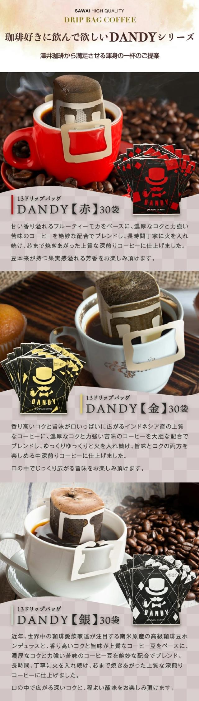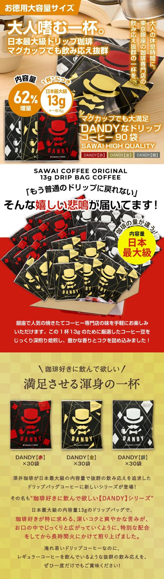 | 内容量 | ●ドリップバッグコーヒー ・DANDY【赤】 13g×30袋 ・DANDY【金】 13g×30袋 ・DANDY【銀】 13g×30袋 |