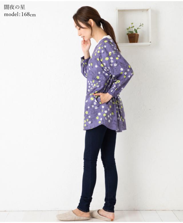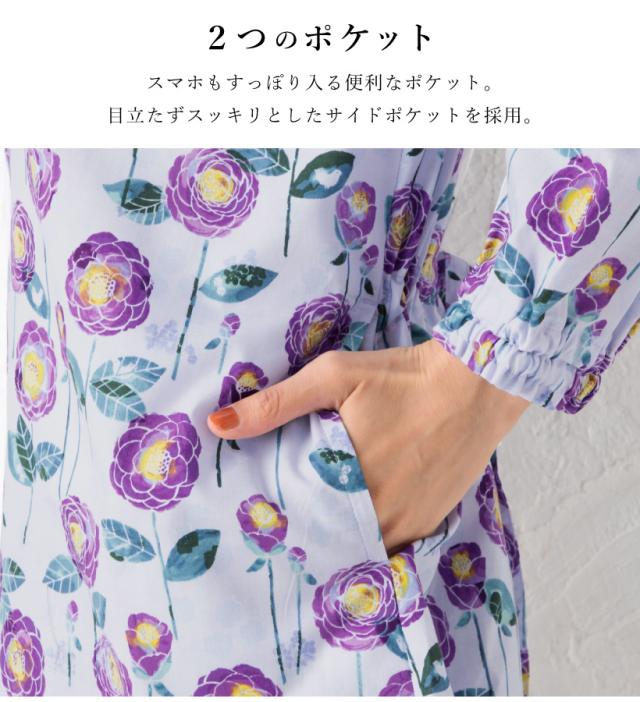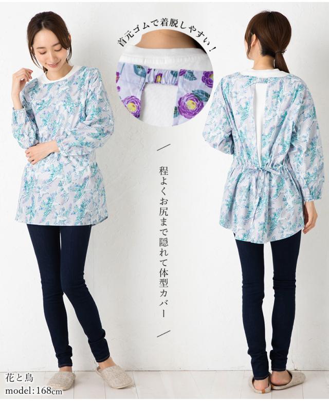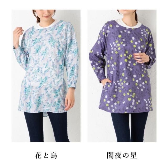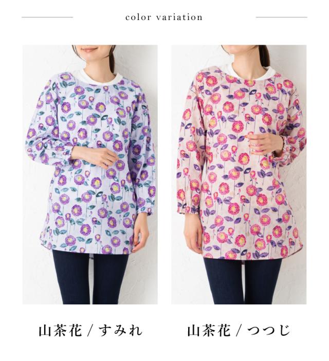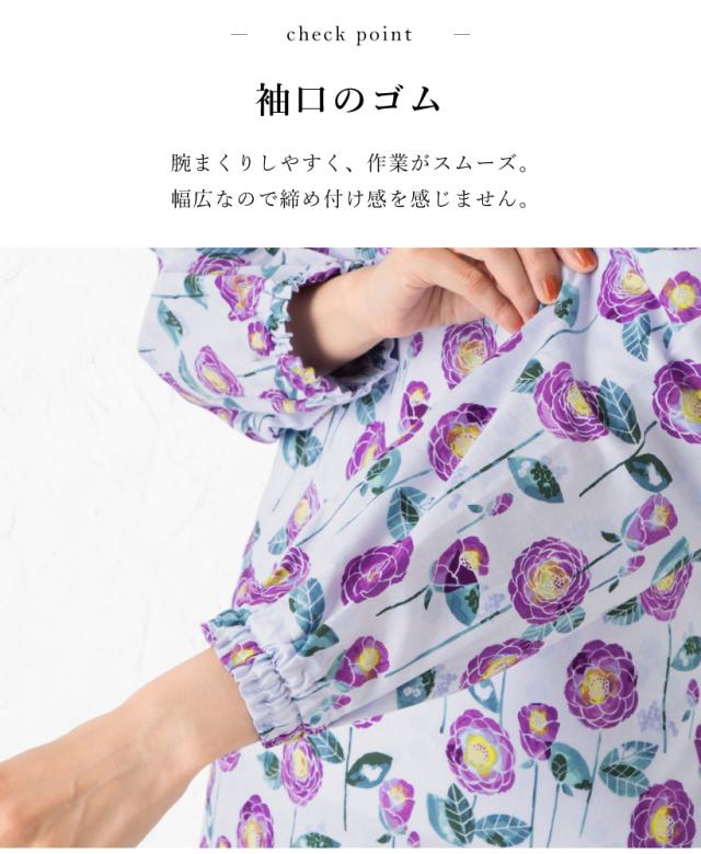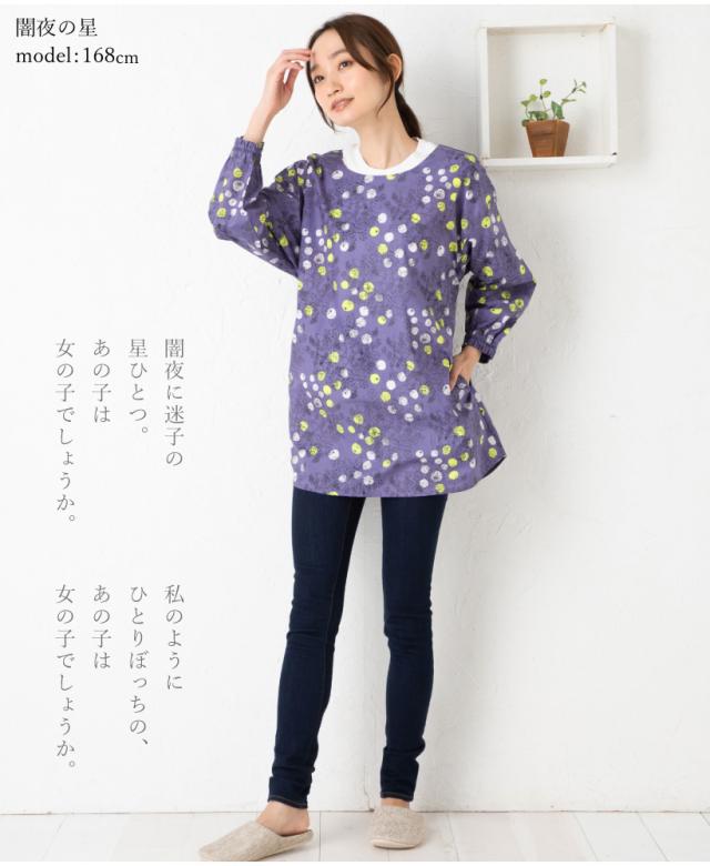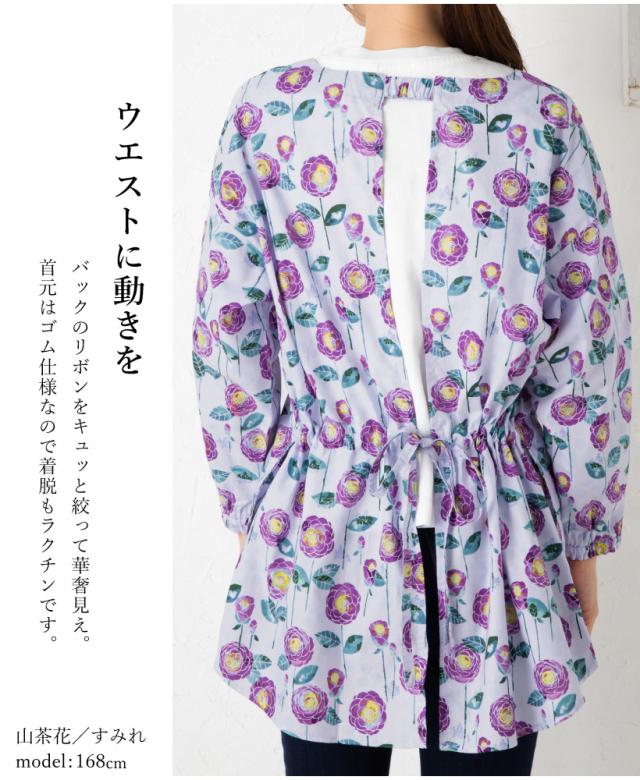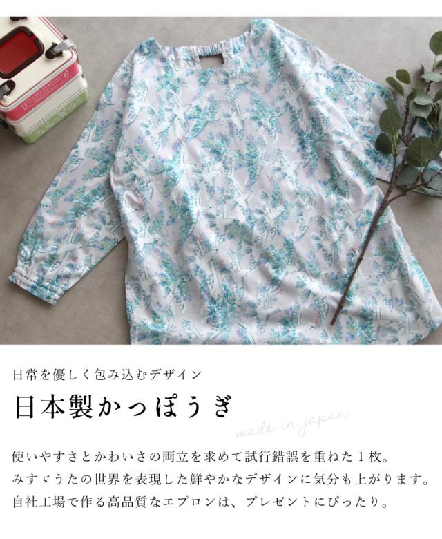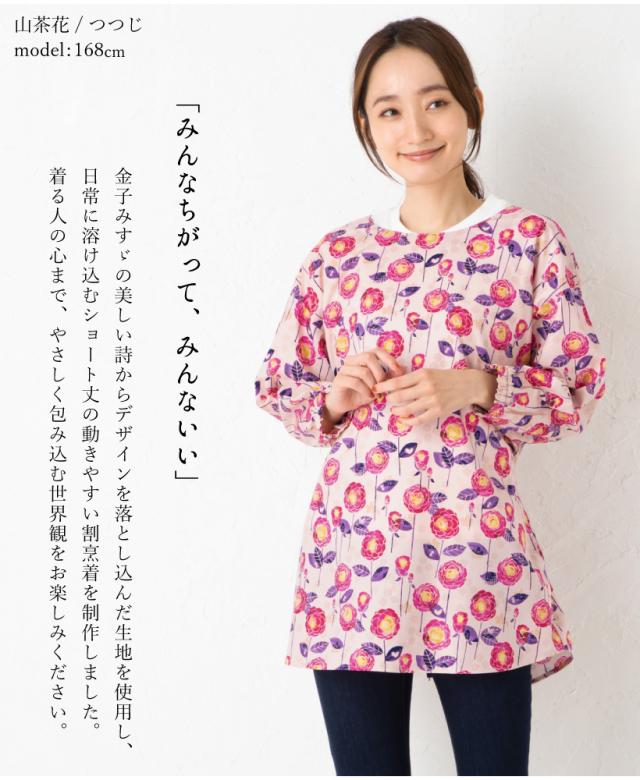 みすゞうたの世界を表現した鮮やかなデザインの高品質な日本製割ぽう着。使いやすさとかわいさの両立を求めて試行錯誤を重ねた1枚。ショート丈で動きやすく、両ポケットを付けて着心地も快適です。やや薄手の生地感なので、春先から秋ごろまで長く愛用していただけます