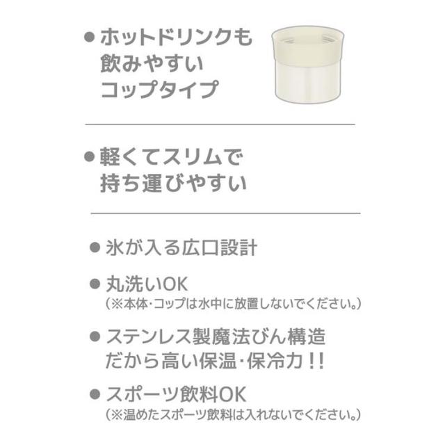 | 本体寸法:約幅6.5*奥行6.5*高さ19cm 重量:約0.2kg 容量:0.35L 口径:約4cm 保温効力(6時間):69度以上 保冷効力(6時間):11度以下 材質:内びん:ステンレス鋼/胴部:ステンレス鋼(アクリル樹脂塗装)/コップ:ポリプロピレン・ステンレス鋼(アクリル樹脂塗装)/中せん:ポリプロピレン/フタパッキン:シリコーンゴム/せんパッキン:シリコーンゴム |
