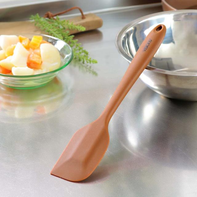 アンバーカラーが目を惹くおしゃれなシリコーン製のへら(スパチュラ)です。耐熱温度が230度なので、お菓子作りでクリームをすくい取るだけでなく、炒め調理やソースづくりなどにも使えます。