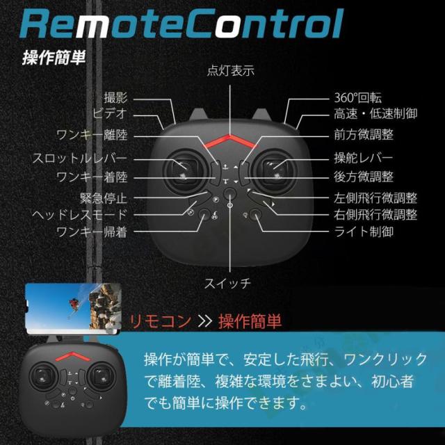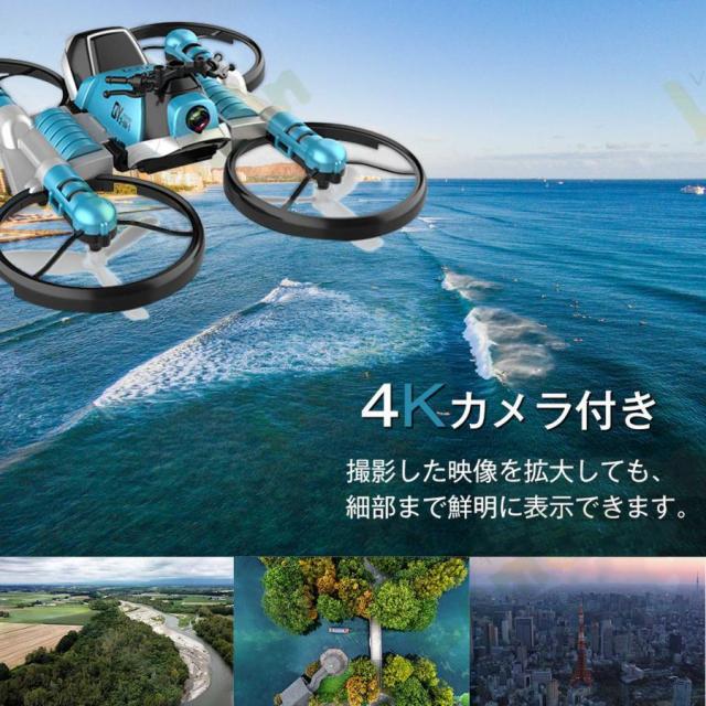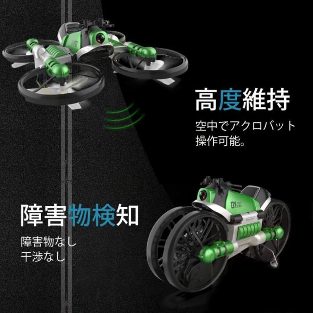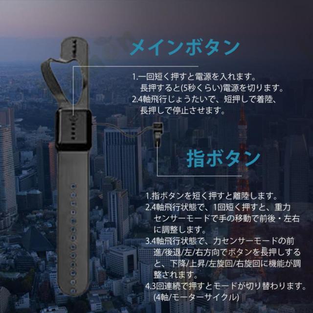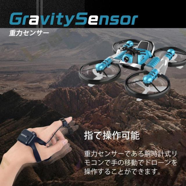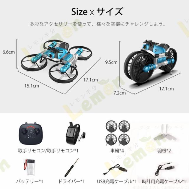 機能:重力センサー 制御が簡単 ワンボタン離陸/着陸 360°回転 ワンボタン帰航 高度維持 プロペラ保護 優携帯性 小型 腕時計式リモコン ヘッドレスモード 変形可能(ドローン、オートバイ)