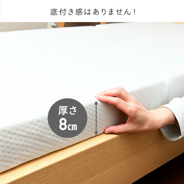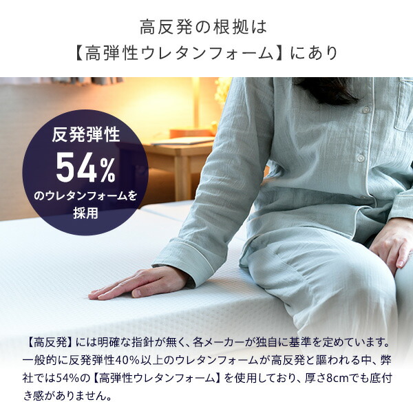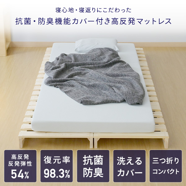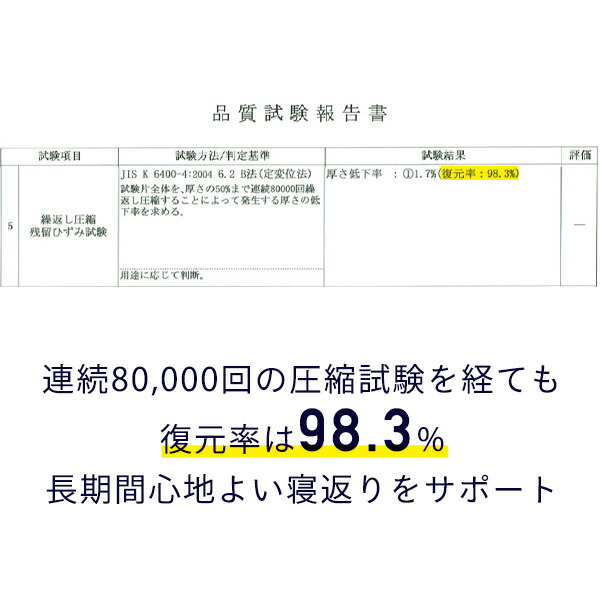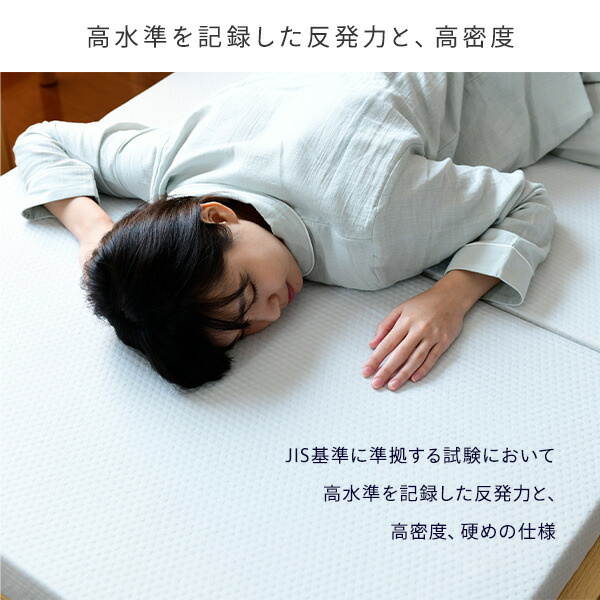 | 商品説明 | ●寝心地・寝返りにこだわった抗菌機能カバー付き高反発マットレス ●高い反発弾性で、心地よい寝返りを実現 ●JIS基準に準拠する試験において高水準を記録した反発力と、高密度、硬めの仕様 ●反発弾性54%のウレタンフォームを採用 ●密度試験においても高水準を記録 ●快適な寝姿勢もキープ可能 ●連続80,000回の圧縮試験を経ても復元率は98.3% ●強い抗菌効果を持つ生地を採用 ●抗菌活性値5.7を記録 ●肌触りも快適 ●洗えるカバー ●カバーをあけるとウレタンフォームは袋入り ●未使用時は三つ折りでコンパクトに収納 ●厚さ8cmでコンパクトサイズだから女性一人でも持ち運びラクラク ●折りたたみ時サイズ 幅80 奥行60 高さ24cm |