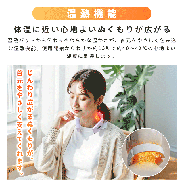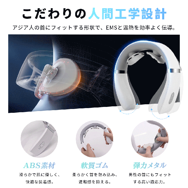 人間工学に基づいて開発された首の湾曲に適してフィット感抜群。現代人の多くが悩まされて首や肩の凝りを解消します。大容量バッテリー内蔵されて、いつでもどこでも手楽にマッサージできます!