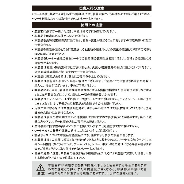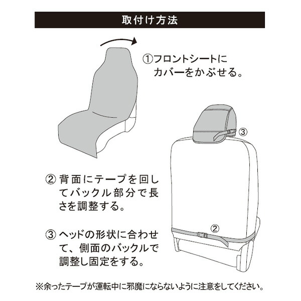 | 商品説明 | ●コーデュラ素材に裏にPVC加工をしたアウトドア用のカーシート ●汚れや雨も気にならないタフなシートカバー ●ヘッドレストにかぶせた後、ベルトで固定するだけ ●軽自動車・普通車・ミニバンなど全般車種に幅広く取り付けができるように設計されたフリーサイズカバー ※シート形状によっては取付けできないシートもございます。シート形状、製品サイズを必ずご確認いただき、装着可能かどうか確かめてからご購入ください ※本体シート機能(リクライニング、アームレスト、レバー、ボタン等)の妨げになる場合がありますのでご注意ください ※本製品による車両、装備品の故障や事故などによる損傷や損害また使用方法の誤りなどにより生じた不具合などについて、当社は一切の責任を負いかねます ※本製品はチャイルドシートずれ防止・保護シートではございません。チャイルドシート等と併用しますと取り付けに不備が生じる事があり危険ですのでお避け下さい ※この商品は、2025年7月30日より、ブラックを追加しております。 |