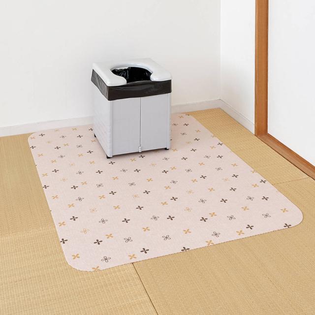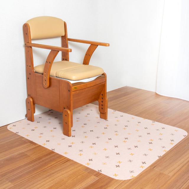 ポータブルトイレまわりをカバーし、床の汚れを防ぐマットです。90×120cmの大判タイプで、家具調のポータブルトイレを置いても、まわりをしっかりとカバーできる大きさです。設置場所に合わせて、ハサミを使って簡単にカットすることができます。
