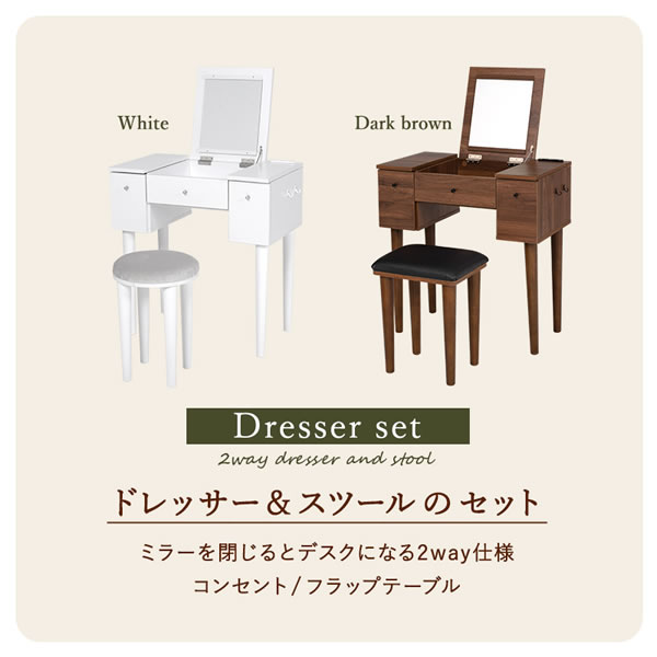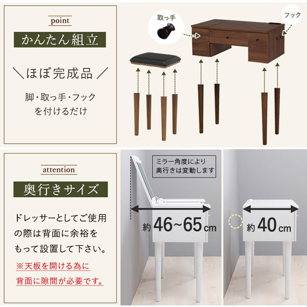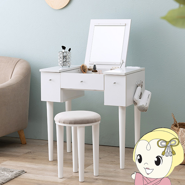 ドレッサー 鏡台 化粧台 ホワイト ミラー 2WAY デスク 収納 組立式 2口コンセント付 テーブル おしゃれ シンプル スツール 萩原