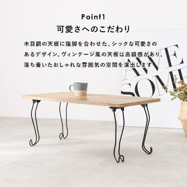 古木風の木目を再現した天板にアイアンの猫脚を合わせた、シックな可愛さのあるデザイン。