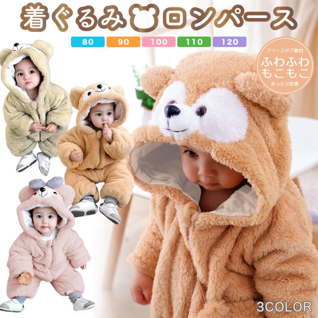 くまさん 着ぐるみ ベビー クマ カバーオール ジャンプスーツ パジャマ 子供 赤ちゃん ロンパース もこもこ ボア あったか 男の子 女の子 男女兼用 秋冬 長袖 新生児 出産祝い プレゼント 防寒 暖かい ハロウィン ギフト ユ00572