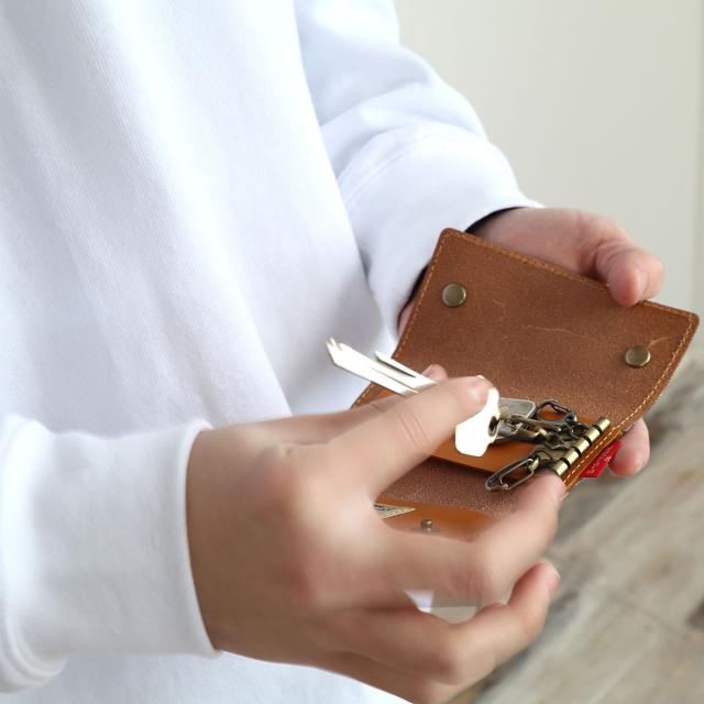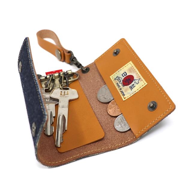 岡山デニムとブラウンレザーの組み合わせ キーケース 前面にBIGJOHNのボンテックスを縫い付け内側にキ−を付ける事ができるフックを4ツ備えております。