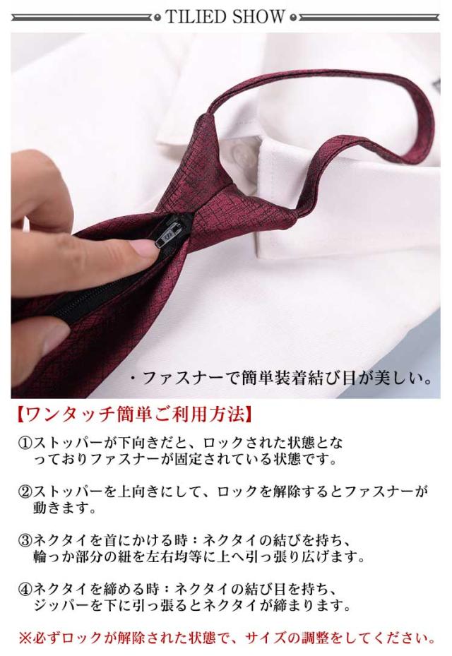 | ・簡単装着!ZIPネクタイ ・ファスナーで簡単装着結び目が美しい。 ・スタイルやシーンを問わずお使い頂けるシンプルかつエレガントなネクタイは細すぎず太すぎない幅は様々なコーデとまとまりもよく相性抜群です。 ・プレゼントとしても喜ばれること間違いなし。 【ワンタッチ簡単ご利用方法】 ストッパーが下向きだと、ロックされた状態となっておりファスナーが固定されている状態です。 ストッパーを上向きにして、ロックを解除するとファスナーが動きます。 ネクタイを首にかける時:ネクタイの結びを持ち、輪っか部分の紐を左右均等に上へ引っ張り広げます。 ネクタイを締める時:ネクタイの結び目を持ち、ジッパーを下に引っ張るとネクタイが締まります。 ※必ずロックが解除された状態で、サイズの調整をしてください。 | |