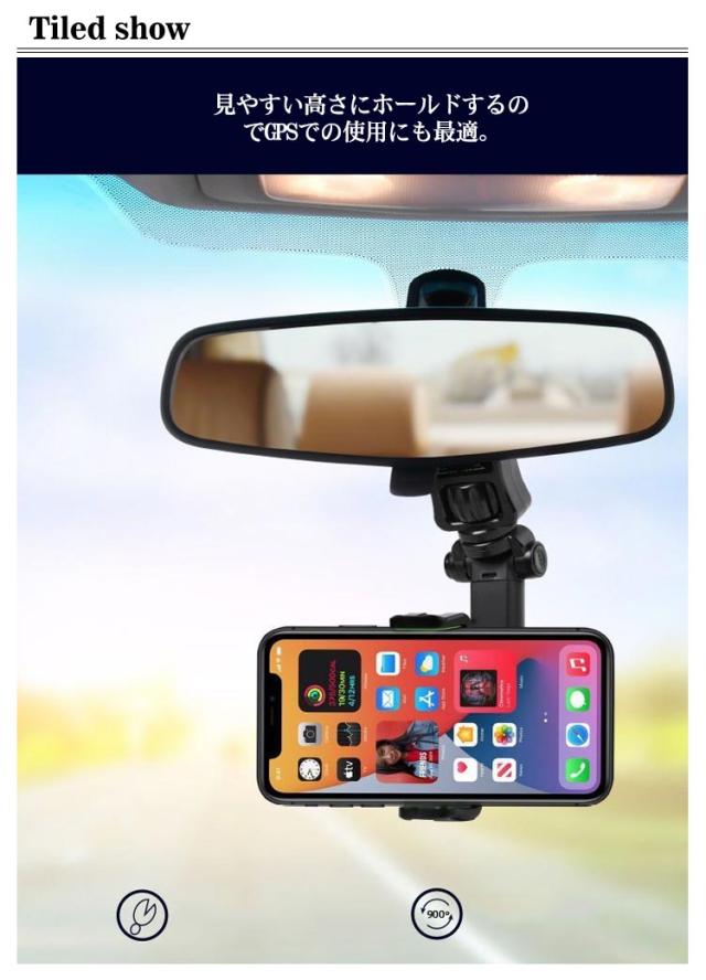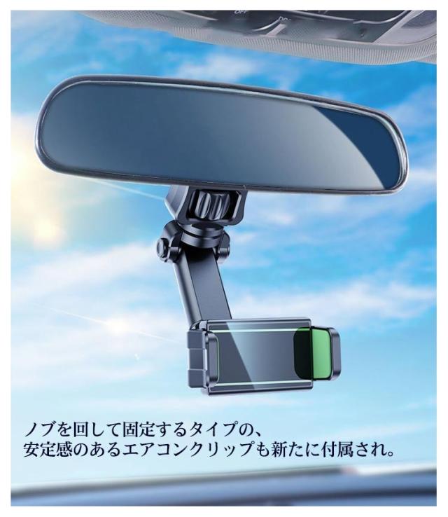 | 車のバックミラーに挟むだけの簡単装着スマホホルダー 。 見やすい高さにホールドするのでGPSでの使用にも最適。 たて・よこや角度調整も可能ですのでとても便利! クリップに柔らかく滑らないシリコン付き、傷や落下を防止に。 ノブを回して固定するタイプの、安定感のあるエアコンクリップも新たに付属され、 ダッシュボード等に設置できない場合、車のエアコンの通気口に設置が可能です。 | |