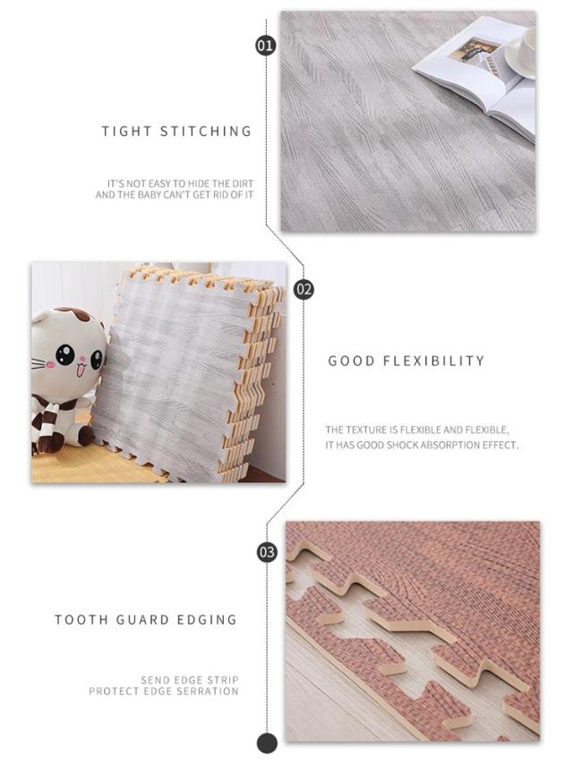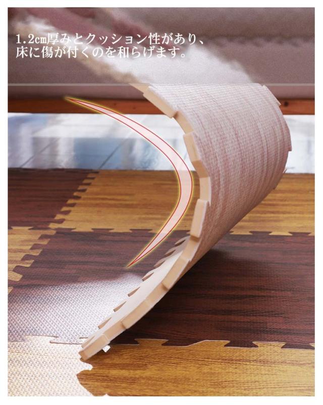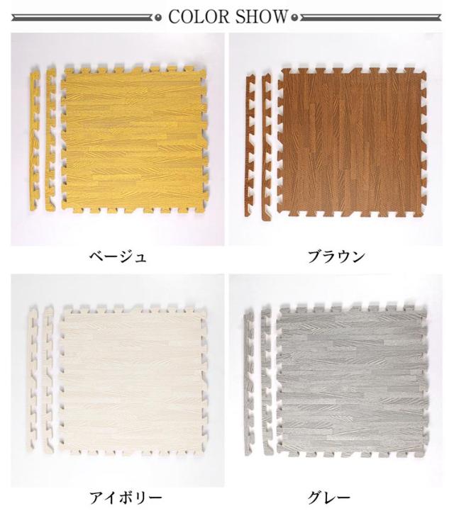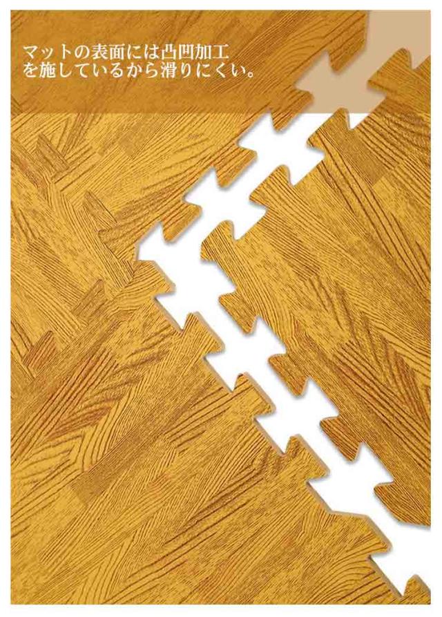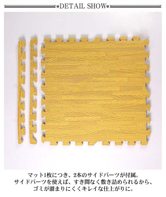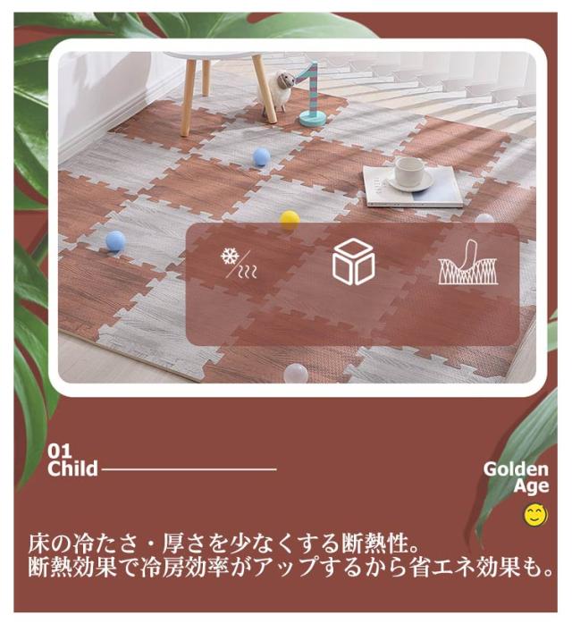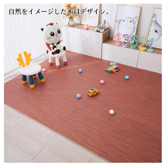| 【木目柄】【厚さ1.2cm】【大判60×60cm】【16枚セット約240*240cm】ナチュラル感のある木目柄ジョイントマット。 クッション性のあるEVA素材は防音効果や保温性があり、クッション効果で階下への騒音も抑えます。お子様のいるご家庭でも安心です。 1.2cm厚みとクッション性があり、床に傷が付くのを和らげます。 床の冷たさ・厚さを少なくする断熱性。断熱効果で冷房効率がアップするから省エネ効果も。 防水性に優れているから、汚れてもサッと一拭きすればOK。 マットの表面には凸凹加工を施しているから滑りにくい。 軽いのでラグを敷くより扱いやすく、模様替えなども簡単。 自然をイメージした木目デザイン。 マット1枚につき、2本のサイドパーツが付属。サイドパーツを使えば、すき間なく敷き詰められるから、ゴミが溜まりにくくキレイな仕上がりに。 60*60*2.5cm 単色16枚set サイドパーツ付き、豊富なテクスチャとカラーで組み合わせ自由自在。 | |
