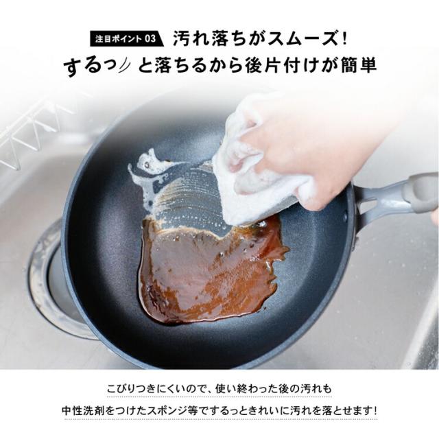 ※ご使用後は、その都度スポンジに中性洗剤をつけてよく洗ってください。長時間汚れたまま放置したり水につけ置きしたりしないでください。腐食(サビ)による、フッ素コーディング・本体・取っ手などの損傷や品質低下の原因になります。
