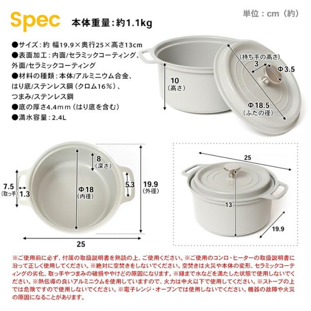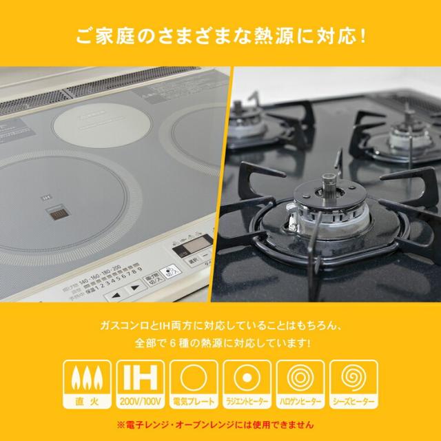 ●対応熱源:直火・IH200V/100V・電気プレート・ラジエントヒーター・ハロゲンヒーター・シーズヒーター
