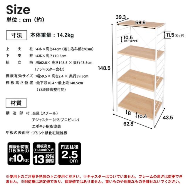 可動棚ラック 4段 メガーラ60 ホワイト/ナチュラル約幅628×奥行435×高さ1485mm コーナンオリジナル LIFELEX
