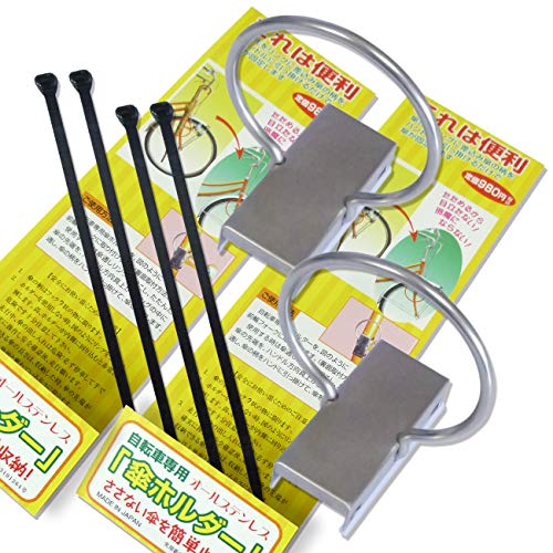 商品名: 自転車用傘ホルダー2個セット 製造国:日本 メーカー: 株式会社アイテック 本体材質: 傘通しリング(内径4.5cm、内側円周13.5cm):ステンレス / 取付台座:ステンレス(ヘアーライン仕上げ) / 固定バンド:ナイロン 付属内容: 自転車用傘ホルダー2個、取扱説明書1枚