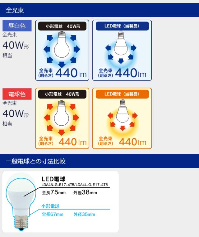 | LED電球 E17広配光タイプ 40形相当 昼白色 440lm LDA4N-G-E17-4T5 スペック情報 | |