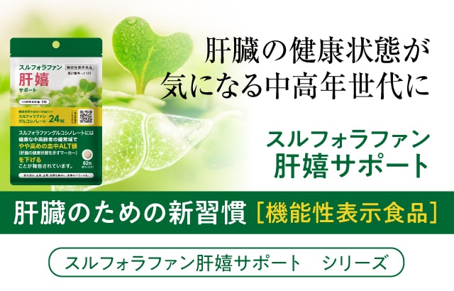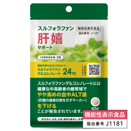 | 届出表示 | 本品にはスルフォラファングルコシノレートが含まれています。スルフォラファングルコシノレートには、健康な中高齢者の健常域でやや高めの血中 ALT値(肝臓の健康状態を示すマーカー)を下げることが報告されています。 |