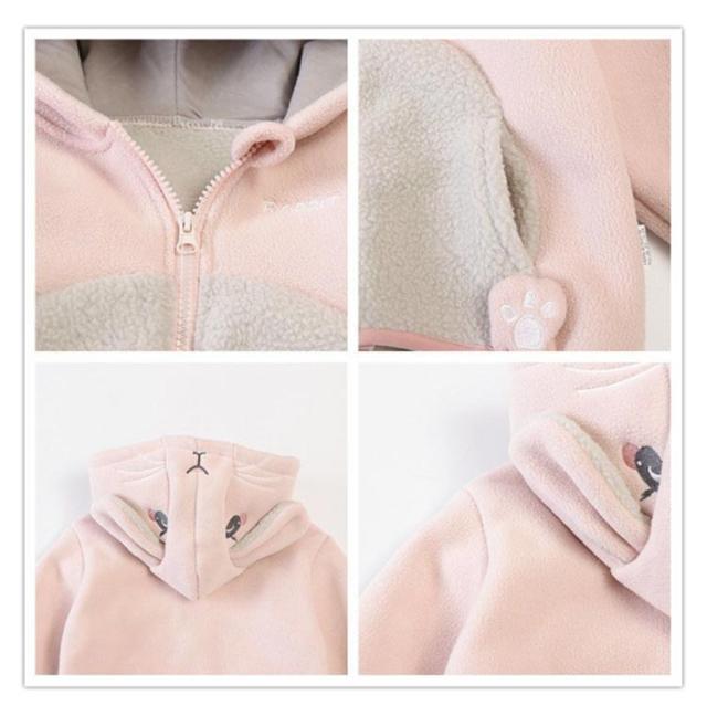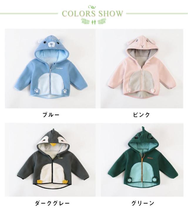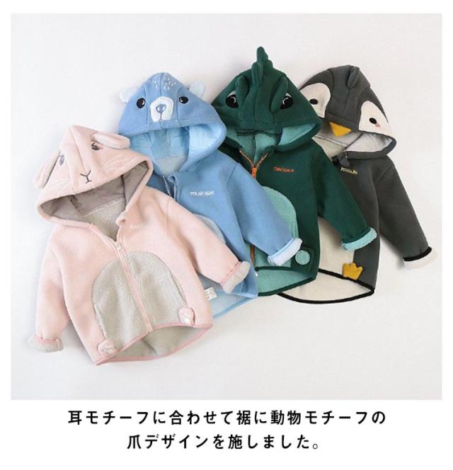| アニマルジャケットでキュートに!秋冬のお出掛けにピッタリ! ピンクはウサギ、ダークグレーはペンギン、グリーンは恐竜、ブルーはクマになれちゃう♪ 耳モチーフに合わせて裾に動物モチーフの爪デザインを施しました。 軽くて暖かなフリース素材で動きやすいのでいっぱい動くお子さまにも安心。 着脱ラクなファスナータイプだから自分でサッと着られます。 | |