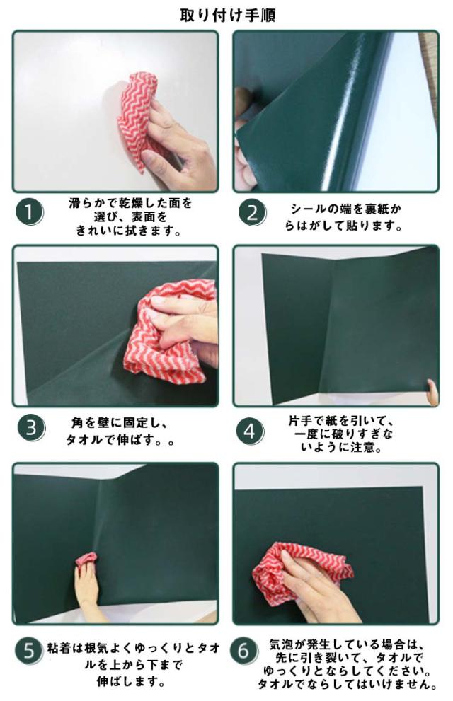 | 掲示板の知らせ、こどもの落書き、壁に貼り買い物リストなど様々な場所に使えるボードシートです。 ガラスの表面、プラスチックの表面、タイルの表面、エマルジョン塗りの壁(家の白壁)、金属の表面、木質の表面など、様々なところに適用します。 表面のPE膜は保護して、輸送中の傷、磨耗、汚れ、残膠などを取り付けます。取り付けが完了したら、さっとはがして、きれいになります 裏面に粘着式を採用し、標準のシートより粘着力をアップし、壁にしっかりと吸着でき、貼り直しも可能で、取り付けやすく、壁を有効に活用します。 取り付け手順 滑らかで乾燥した面を選び、表面をきれいに拭きます。 シールの端を裏紙からはがして貼ります。 角を壁に固定し、タオルで伸ばす。 片手で紙を引いて、一度に破りすぎないように注意。 粘着は根気よくゆっくりとタオルを上から下まで伸ばします。 気泡が発生している場合は、先に引き裂いて、タオルでゆっくりとならしてください。タオルでならしてはいけません。 | |