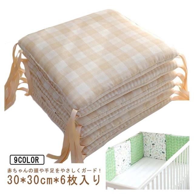 | 赤ちゃんの頭や手足をやさしくガード!30*30cm*6枚入り ベビーベッドの柵に赤ちゃんの頭や手足が当たるのをやさしくガード。 エアコンや扇風機、ヒーターなどの直接の冷風や温風から、赤ちゃんをやさしく守ってくれます。 カバーはやわらかくてふんわりサラッとした肌触りの綿カーゼを採用。 シンプルなプリントと優しい風合いが赤ちゃんをやさしく包みます。 ベッドへの設置は紐で留めるだけ 厚みのある柔らかウレタンを使用しているので、ベッドへのごっつんをやさしくガードします。 手洗いOKなので汚れても安心。 ペッドガードや子ども用座布団、さらにお昼寝マットとしてなどマルチな使い方ができる便利なクッションです! | |