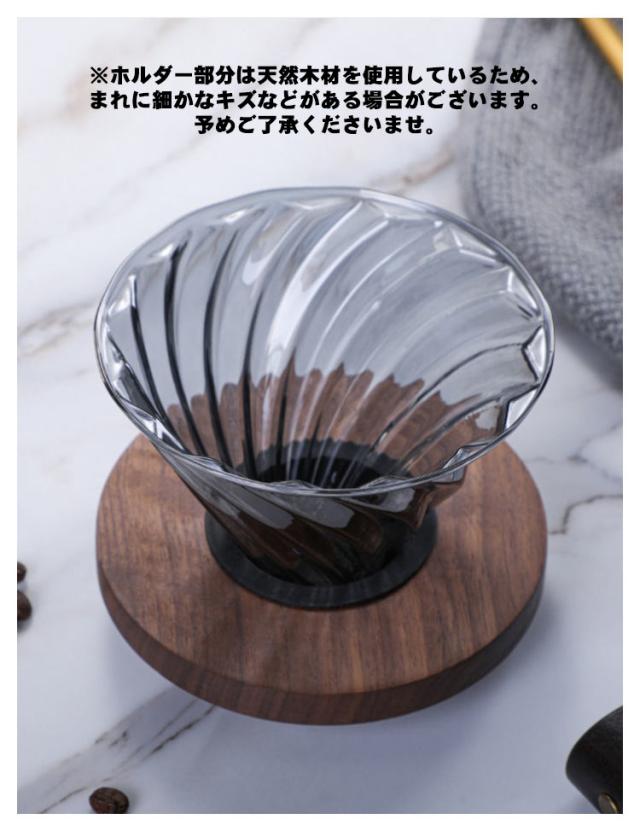 | ペーパーフィルター 100枚付き!コーヒードリッパーとサーバーのセットです。 コーヒー粉の層を深くして蒸らし効果を高め、注がれたお湯が一点に向かって流れる耐熱ガラス製円錐形ドリッパー。ペーパーを浮かせるスパイラルリブを採用しネルドリップの味を再現できます。香りとコク、雑味のないまろやかな味のコーヒーが淹れられます。 ※ホルダー部分は天然木材を使用しているため、まれに細かなキズなどがある場合がございます。予めご了承くださいませ。 操作手順:1、フィルターを置く。2、ろ紙を置く。3、コーヒー粉を粉入れ。4、泡立て漉き。5、味見。 | |