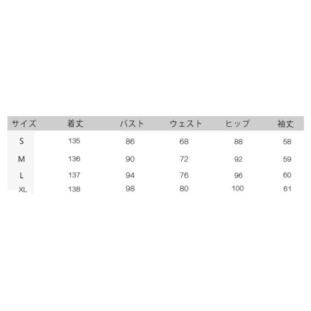 | サイズについての説明 | サイズ 総長 バスト ウエスト ヒップ 袖丈 ※サイズ表の実寸法は商品によって1-3cm程度の誤差がある場合がございます。 |