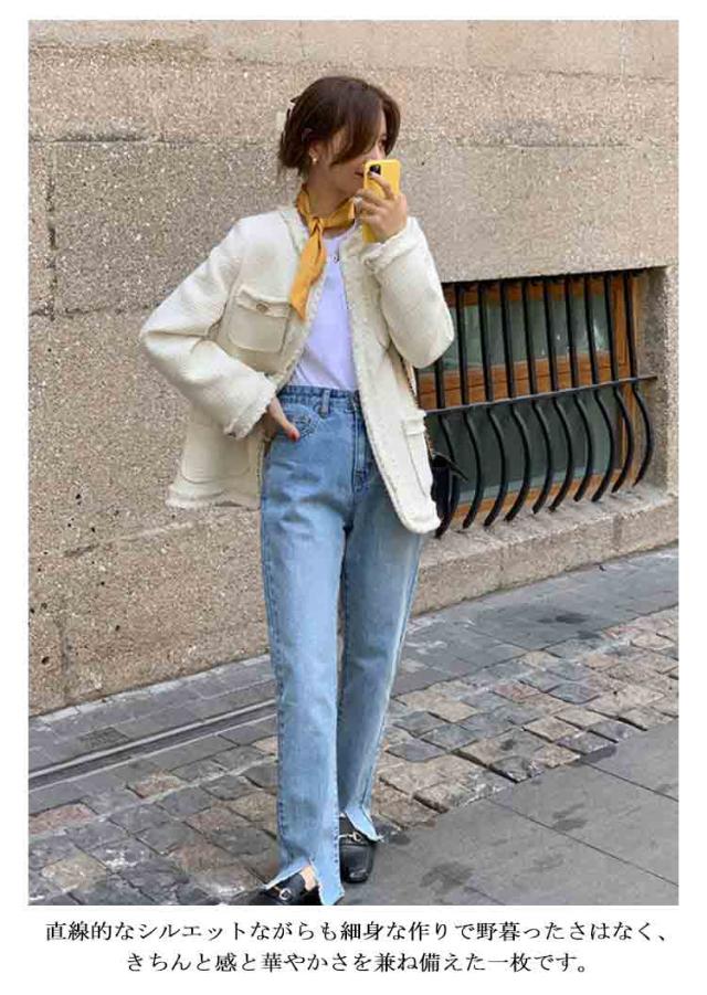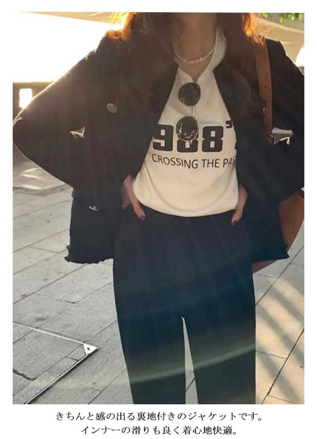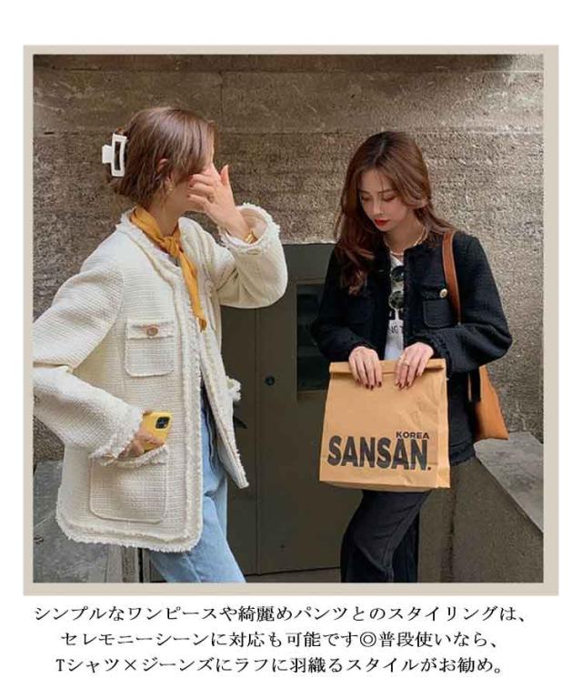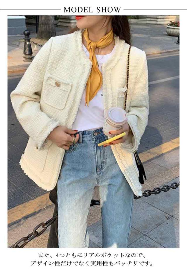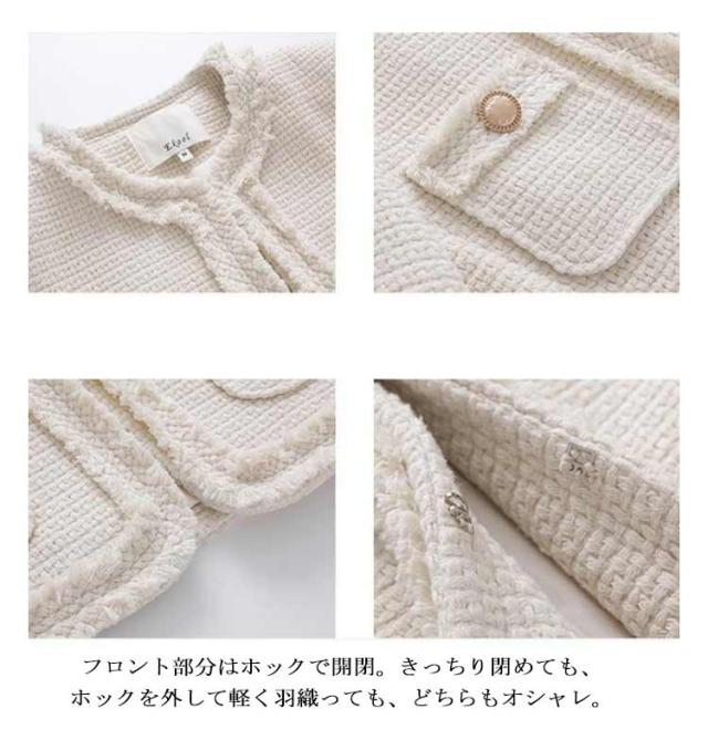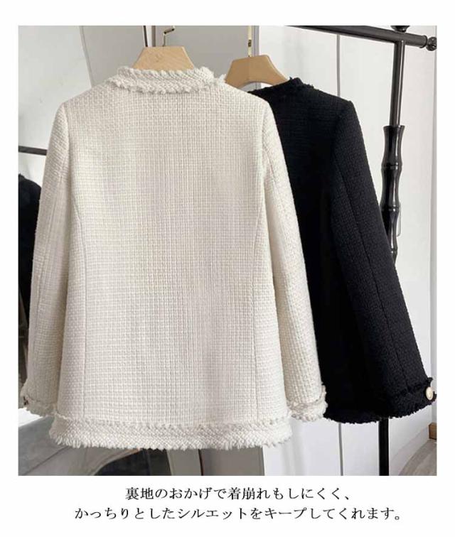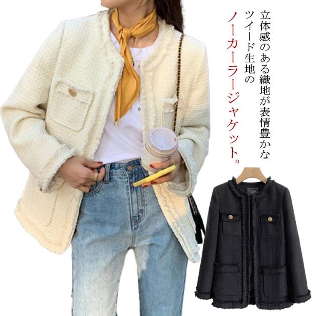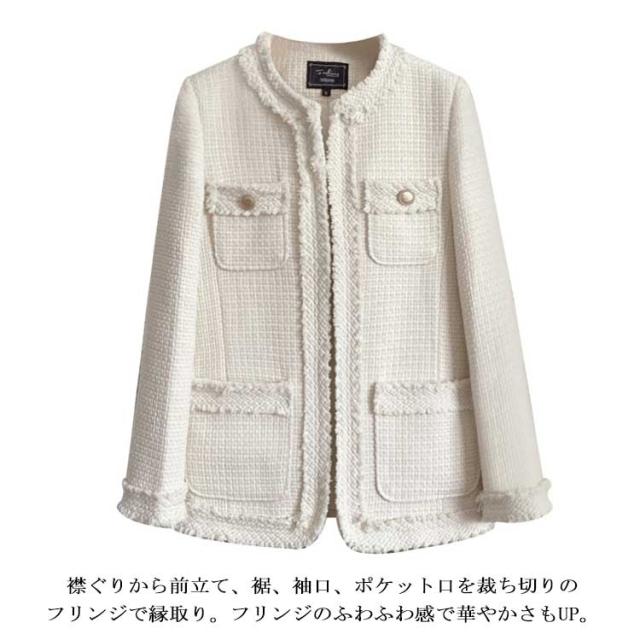ノーカラージャケット レディース ツイード ジャケット フリンジ フォーマル ライトアウター 春 秋冬 ツイードジャケット 裏地付き ロング丈 大人可愛い フェミニン 通勤 オフィス カジュアル 20代 30代 40代 ホック留め