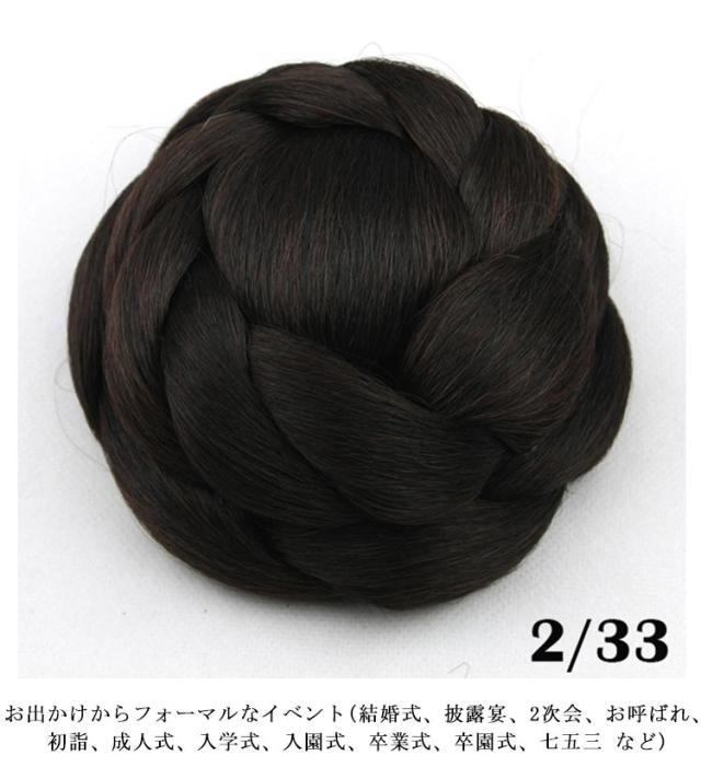 | 編み込みのアレンジがされたシニヨンタイプのウィッグ 着物、浴衣(ゆかた)、袴(はかま)といった和装にも似合います。 お出かけからフォーマルなイベント(結婚式、 披露宴、2次会、お呼ばれ、初詣、成人式、 入学式、入園式、卒業式、卒園式、七五三 など) での髪型・ヘアスタイルを作る際にもどうぞ! | |