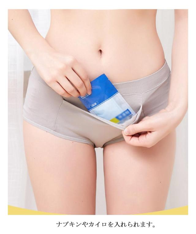 | 便利なポケット付き!ナプキンやカイロを入れられます。 お尻から腰にかけて撥水生地を使用、多い日でも安心です。 ハイウエストで腰が冷えにくい! お尻をすっぼり包み幅広のウエストゴムを使用しているのでずれにくく、快適です。 | |