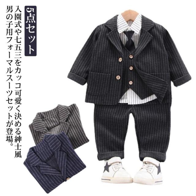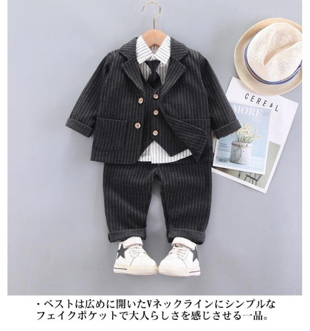 ベビー服 フォーマル スーツ キッズ 上下セット 5点セット ネクタイ付き ジャケット+ベスト+シャツ+パンツ+ネクタイ 赤ちゃん 男の子 男児 ストライプ柄 発表会 入学式 結婚式 おしゃれ カジュアル 全3色