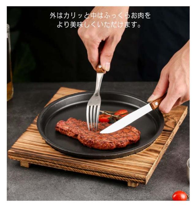 | 家庭でステーキレストランの雰囲気が、味わえます。 ガス火の他、IH100-200Vの電源に対応! またステーキはもちろん、パスタ、焼きそば、ハンバーグなども熱々のまま美味しく頂けます。 鉄鋳物は、熱伝導が均一で蓄熱性が良く、 外はカリッと中はふっくらお肉をより美味しくいただけます。 | |