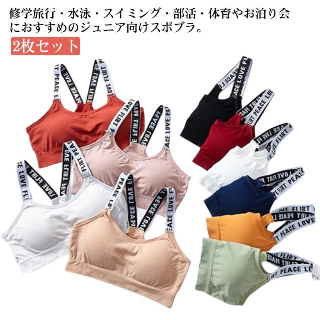 2枚セット ジュニア向け スポーツブラ カップ付き 女の子 子供用下着 肌着 キッズ 肩ひもロゴ ロゴテープ 無地 フリーサイズ ファーストブラ ベアトップ アンダーウェア チューブトップ 小学生 中学生